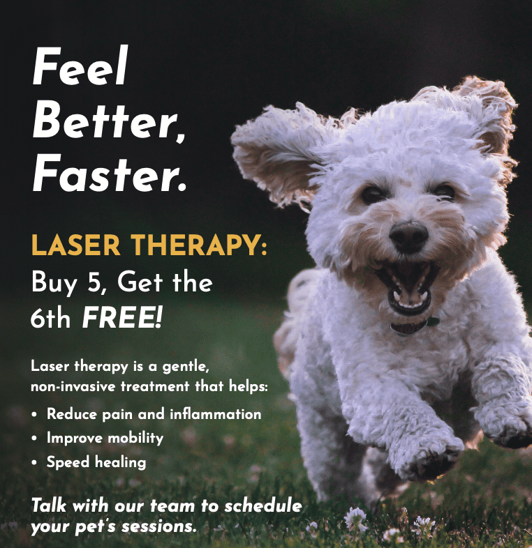 Promotions Laser Therapy Promotion Buy 5, Get The 6th Free! View More Details Referral Rewards Program Qualify for Exclusive Rewards View More Details Free Dental Consultations Meet with a Registered Veterinary Technician View More Details Free Nutritional Consultations Schedule a Meeting with Bria Yeryk, RVT View More Details